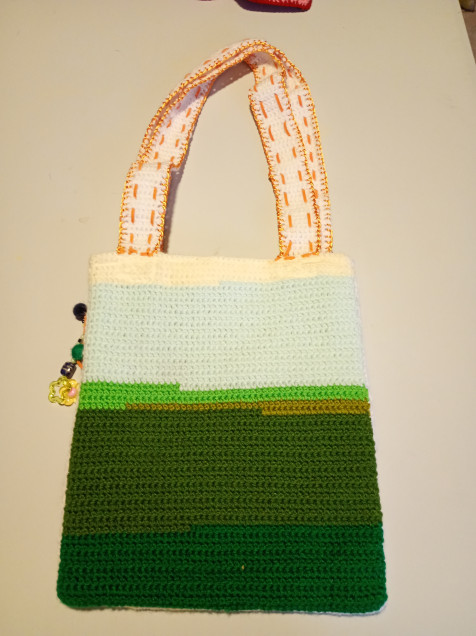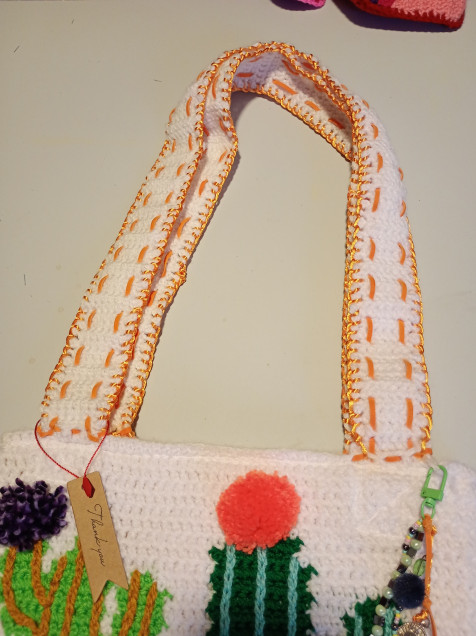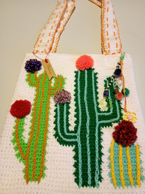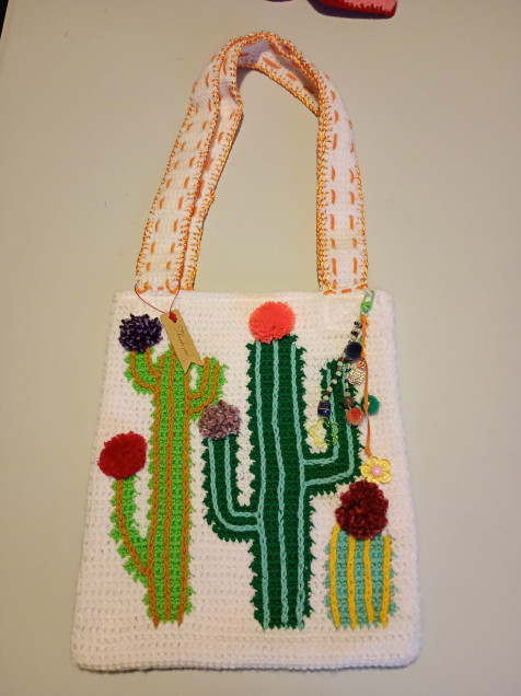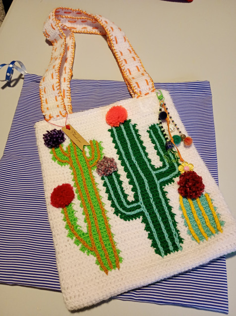 Tejido de patrón con borlas del mismo hilo. Asas tejidas y reforzadas para mayor resistencia. Completamente forrada y con bolsillos internos. 30cm de ancho x 35 de alto. Se envía con cubre polvo y llavero de colguijes.