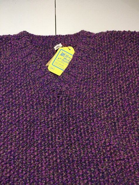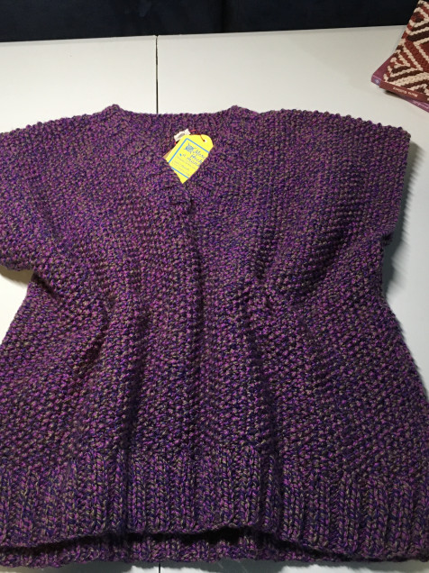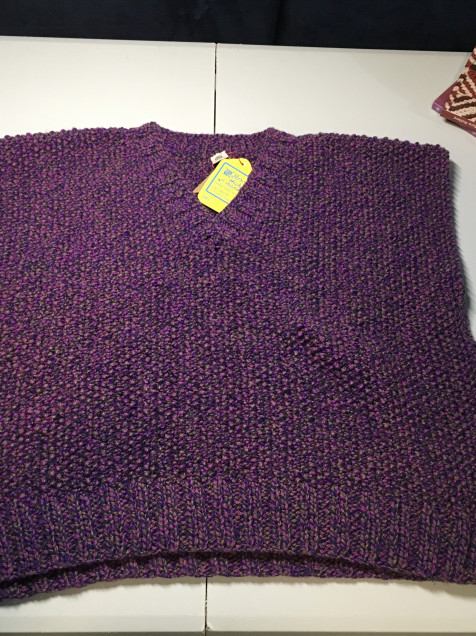 Tejido a dos agujas en el clásico punto de arroz. Estambre de grosor medio. Manga rangla y cuello en V. Medidas: contorno de busto 112. Largo 53cm.