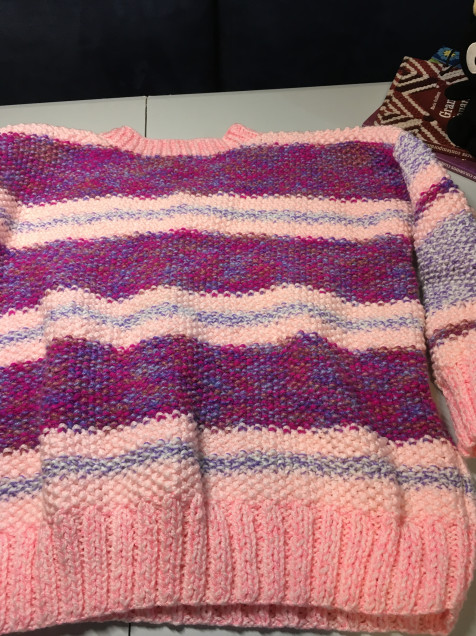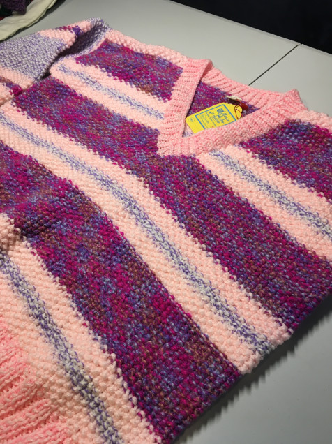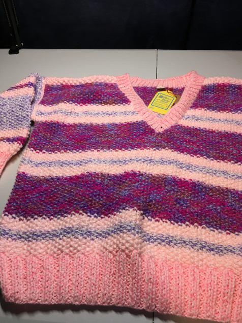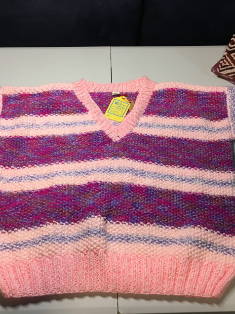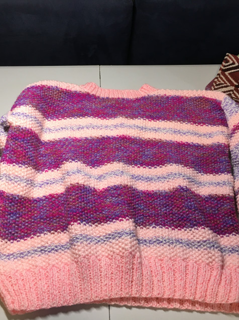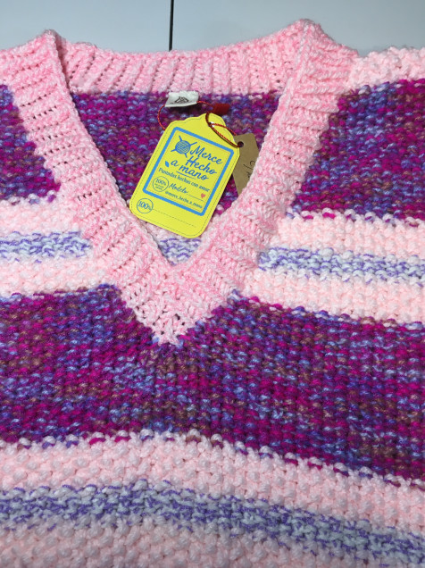 Tejido en el clásico punto de arroz con dos agujas. Tiene diversas tonalidades de Rosa y Violeta. Es de hombros caídos por lo que se ajusta acualquier tipo de cuerpo. Estambre de grosor medio. Medidas: contorno de busto 116cm, largo 54cm.