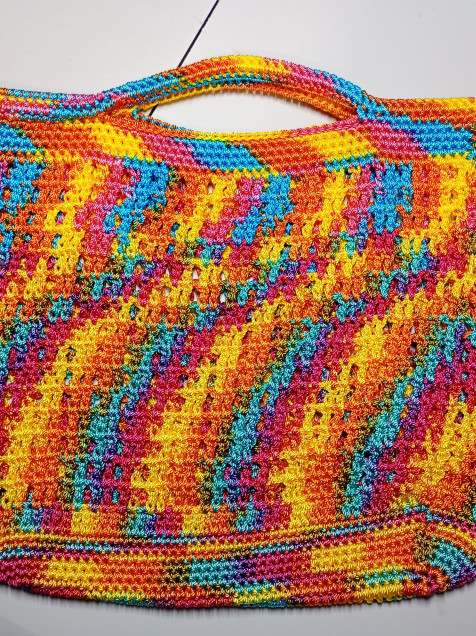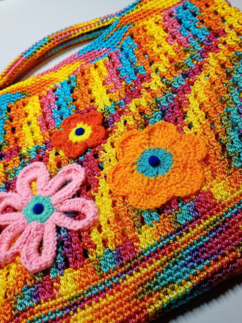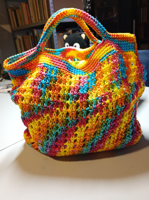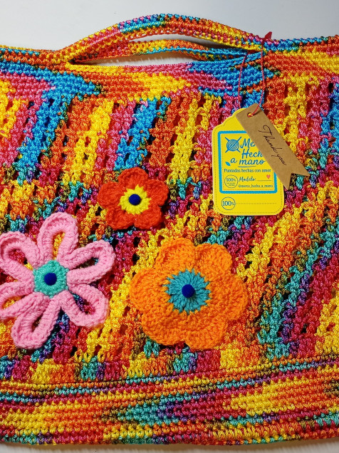 Bolsa tejida a crochet en doble cadeneta, con asas integradas del mismo material. Hilo naylon, súper resistente. 33 de ancho x 23 de alto x 9 de amplitud. Súper versátil