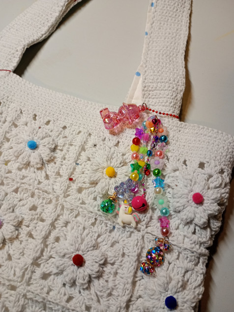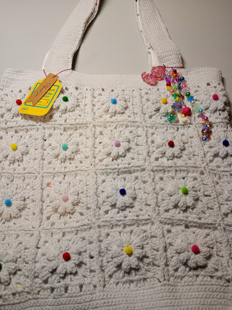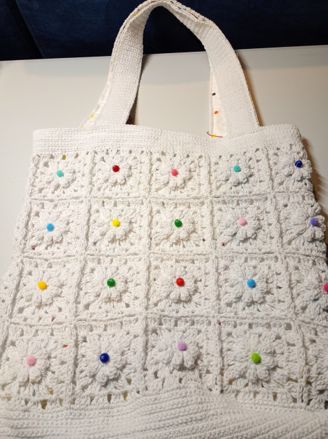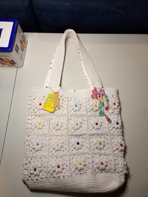 Bolsa hecha a crochet en hilaza de algodón blanco. Granny square de flores con detalles en colores y llavero. Completamente forrada. Bolsa Interior con cierre. Medidas: 36cm de alto, 39cm ancho y 7cm de profundidad. Correas largas.