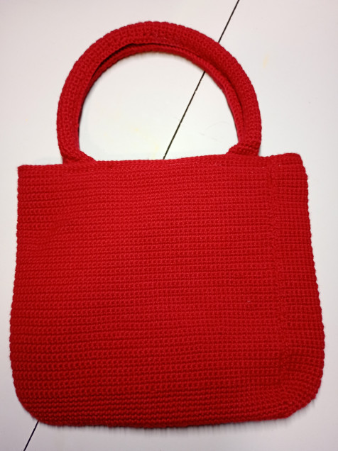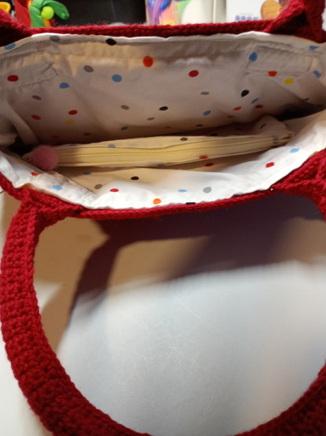 Bolsa en crochet de medio punto. Hilaza de algodón 100%. Completamente forrada. Asas dobles. Tiene una pequeña bolsa cosmetiquera para el interior. Mide 23cm de alto por 28cm de ancho. Súper cute!!!