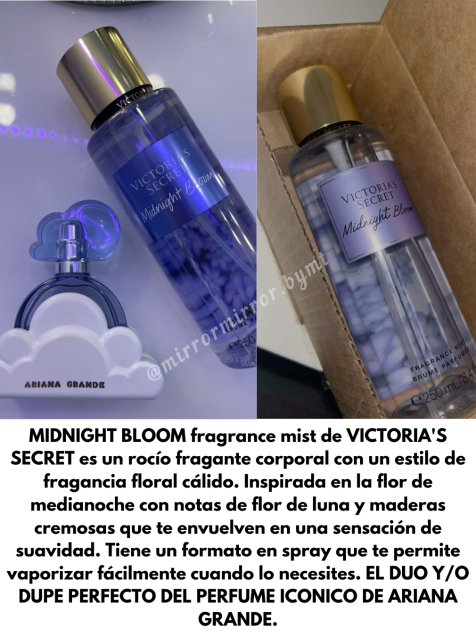 ⭐Mist, olor super rico, de los mas pedidos. EL DUO Y/O DUPE PERFECTO DEL PERFUME ICONICO DE ARIANA GRANDE. MIDNIGHT BLOOM fragrance mist de VICTORIA'S SECRET es un rocío fragante corporal con un estilo de fragancia floral cálido. Inspirada en la flor de medianoche con notas de flor de luna y maderas cremosas que te envuelven en una sensación de suavidad. Tiene un formato en spray que te permite vaporizar fácilmente cuando lo necesites.