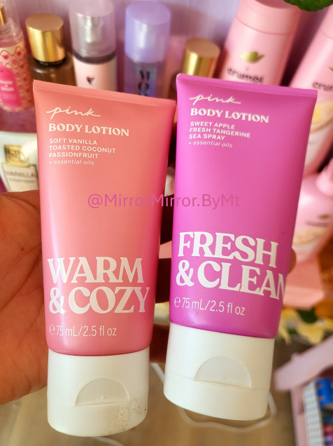 ⭐¡Mini lociones corporales Pink! Perfectas para llevar contigo a donde sea. Escoge entre "Warm & Cozy" (vainilla suave, coco tostado y maracuyá) o "Fresh & Clean" (manzana dulce, mandarina fresca y rocío marino). ¡Un toque de hidratación y aroma celestial!