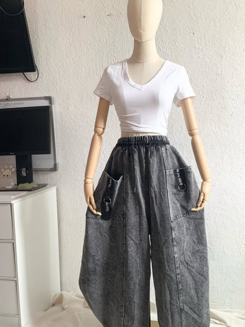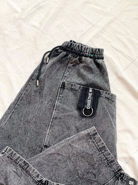 Cintura: 66/90 cm (ajustable) , cadera: 110 cm (su estilo es flojo), tiro: 30 cm y largo: 101 cm