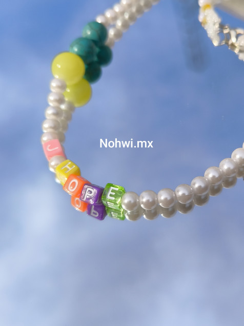 Hecho de perlas sintéticas y letras de acrílico, mide $37cm