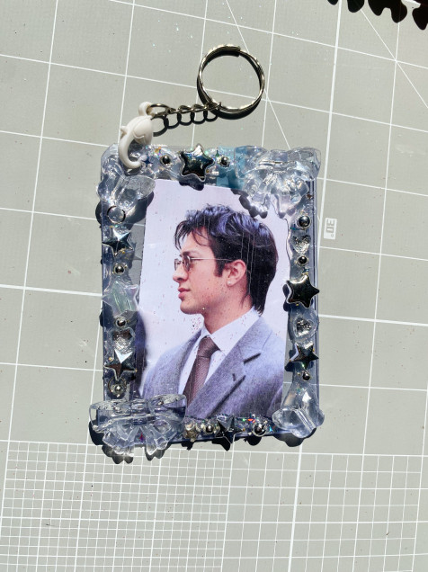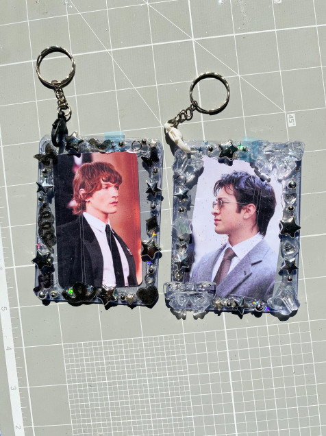 este es un llavero con piezas de acrilico pegadas en el marco del toploader ♡