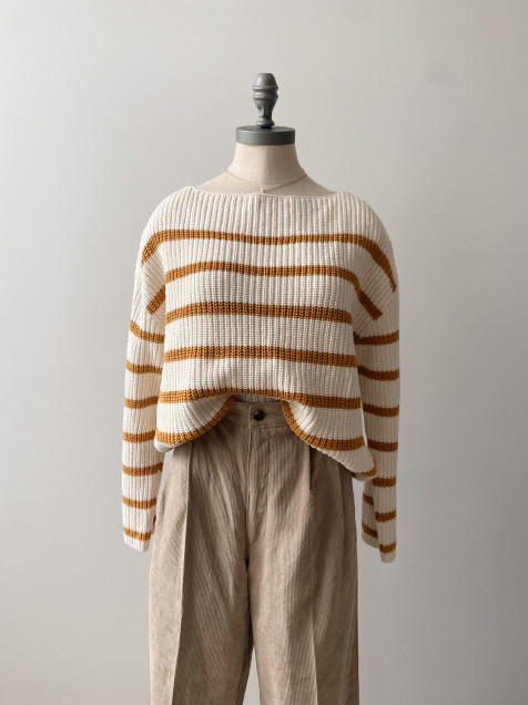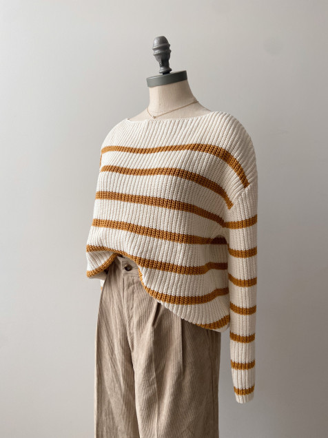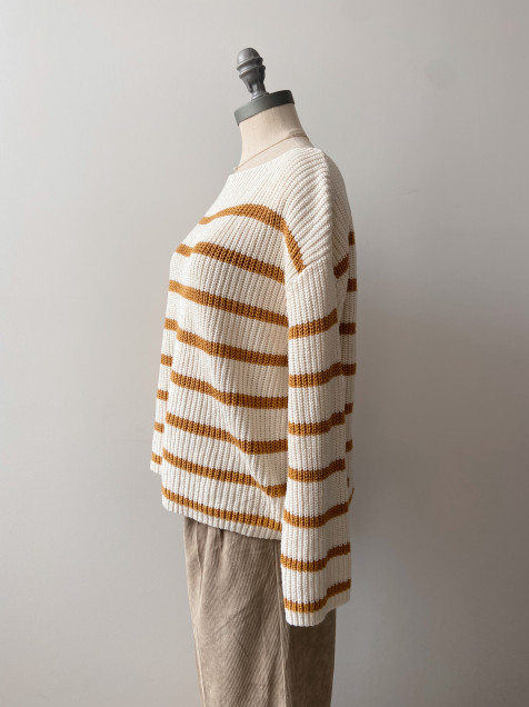 Descripción: Sueter de punto con cuello barco, fondo beige con líneas mostaza, nuevo sin etiquetas.