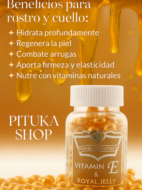 ¡Dale un boost de juventud a tu piel! Cápsulas faciales con vitamina E y jalea real que nutren e hidratan. Su fórmula ayuda a fortalecer la piel, dejándola radiante y protegiéndola contra factores ambientales. ¡Consigue un cutis de impacto con 90 cápsulas llenas de vitalidad!