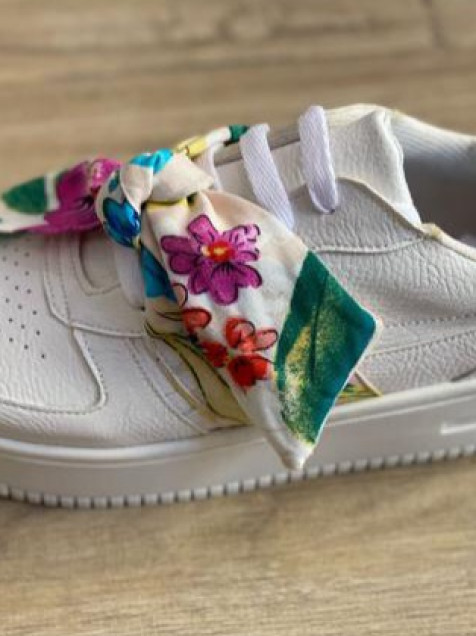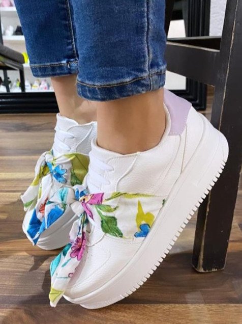 Tenis blancos con pequeña plataforma y bandana en la parte frontal