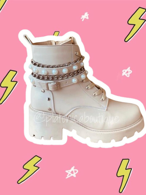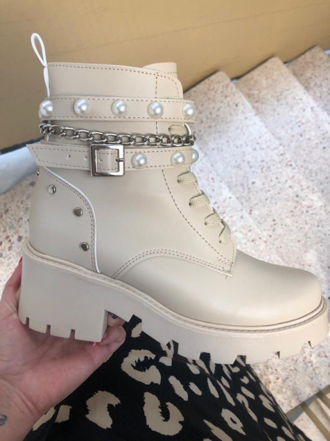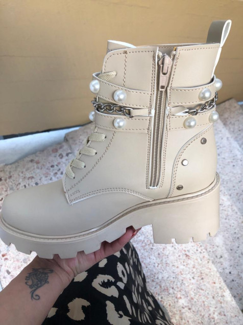 Botines beige con perlas y cadena, tiene cierre.