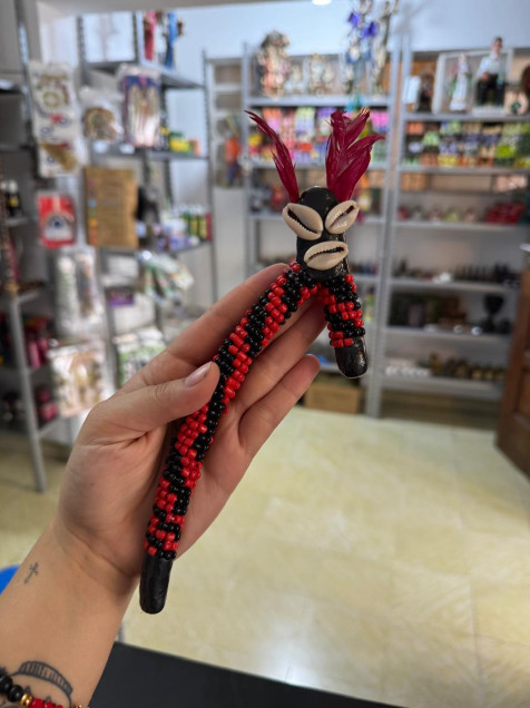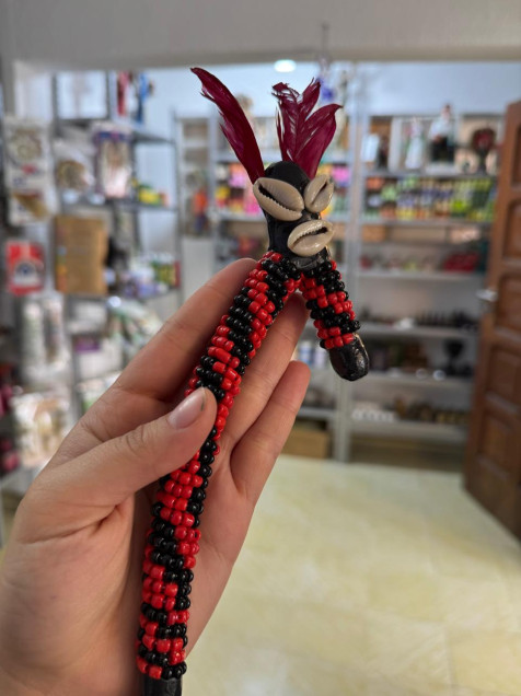 Amuleto hecho a mano con cuentas rojas negras y conchas.