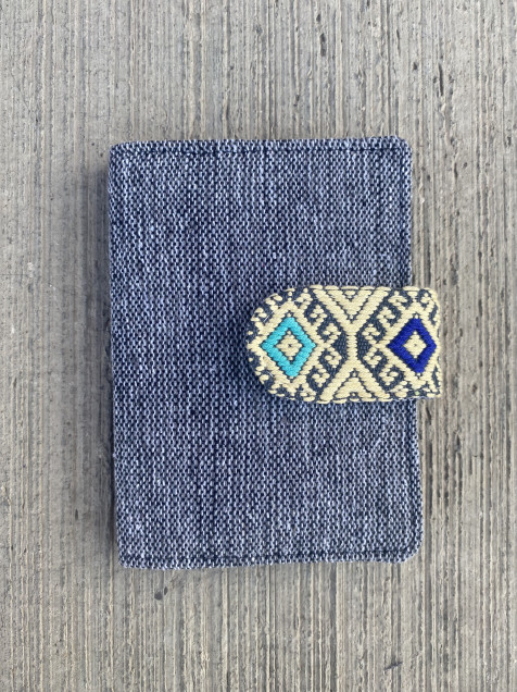 Portapasaporte elaborado con una combinación de textiles de Oaxaca y Chiapas.