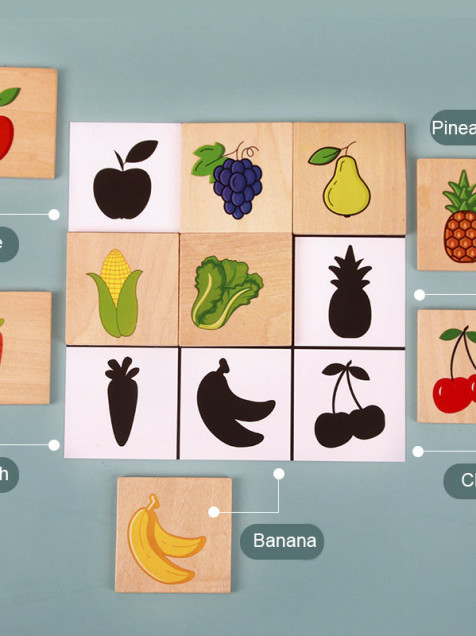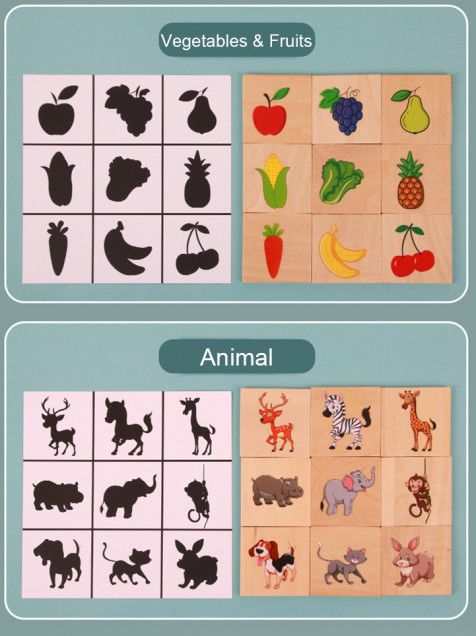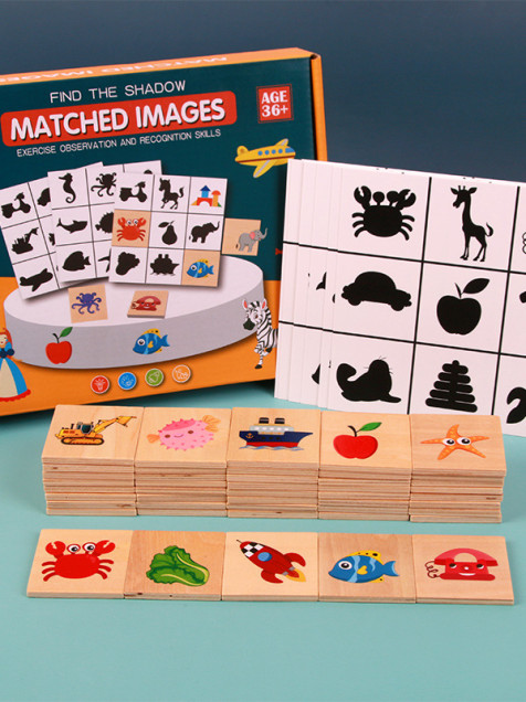 1 Juego de memoria o sombras con 10 tarjetas y cartón y 45 fichas de madera.