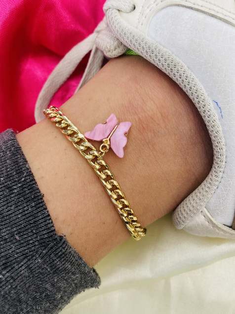 Tobillera de acero inoxidable con dije de mariposa rosa.