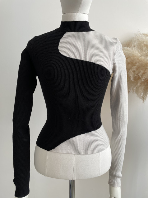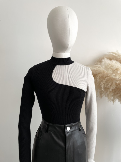 Blusa de punto bicolor blanco y negro con cuello alto. La tela estira.