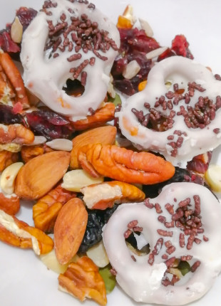 Nueces y pretzel con chocolate blanco