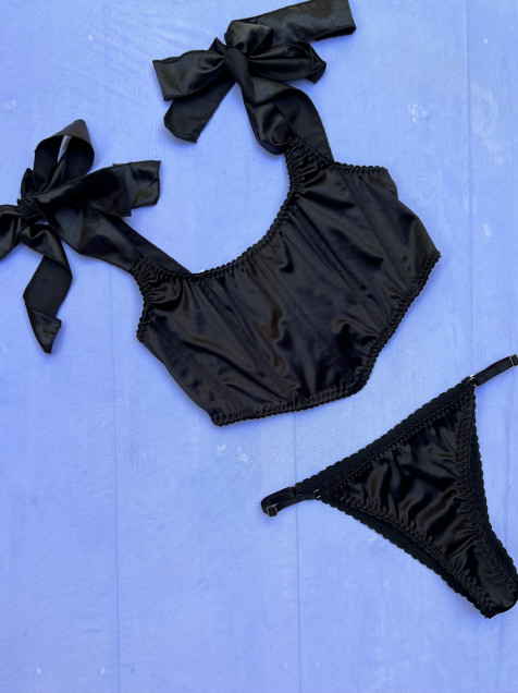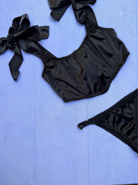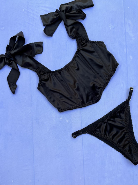 Set de corset negro de saten y panty ajustable talla mediana , precio especial por ser pieza única