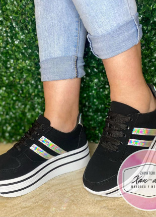 tenis de plataforma alta negros rayas tornasol