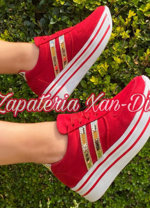 tenis de plataforma alta rojos gamuza rayas oro