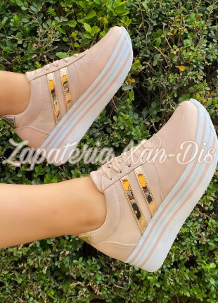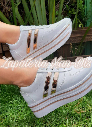 tenis de plataforma blancos rayas oro rosa