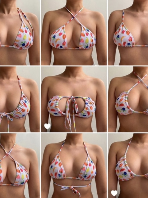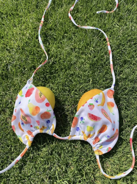 🍊Top triangular ajustable en estampado exclusivo de frutas. Forro interno en color nude.