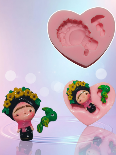 Crea adorables figuras de Frida y su lorito con este molde de silicón en forma de corazón. ¡Ideal para porcelana fria, con un toque mexicano! Fácil de usar y limpiar.