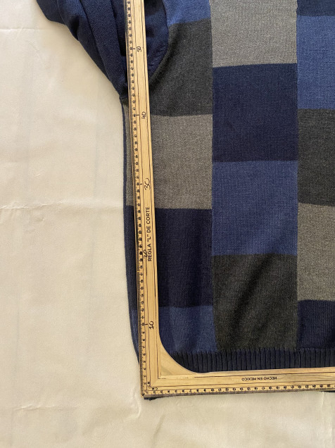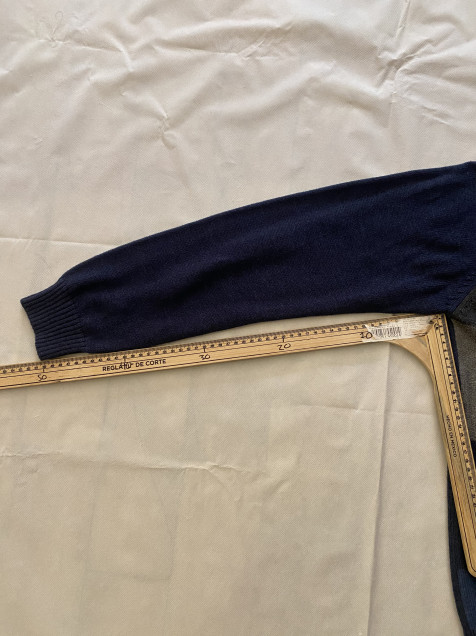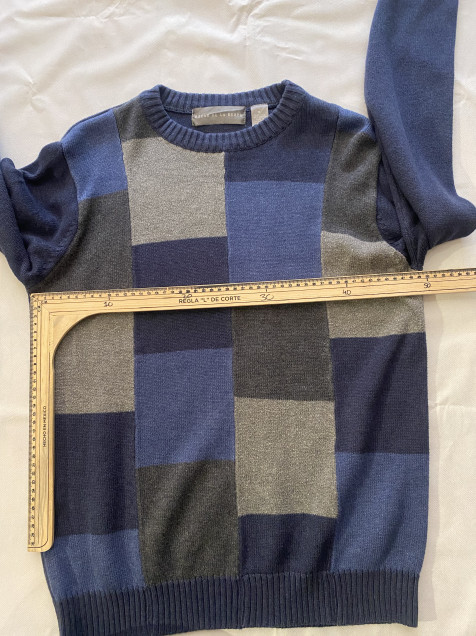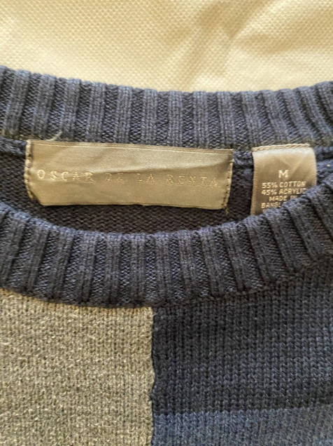 Los diseños tipo patchwork se han vuelto clave dentro del estilo vintage por su composición visual y personalidad única. Esta pieza de Oscar de la Renta combina bloques en tonos azules y grises, creando un suéter con presencia, textura y estética contemporánea.
