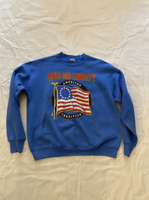 Las sudaderas gráficas con estética americana han ganado fuerza dentro del estilo vintage por su carácter visual y referencias culturales. Esta pieza de Fruit of the Loom presenta un diseño frontal con bandera y tipografía “Give Me Liberty”, logrando un look retro con mucha personalidad.