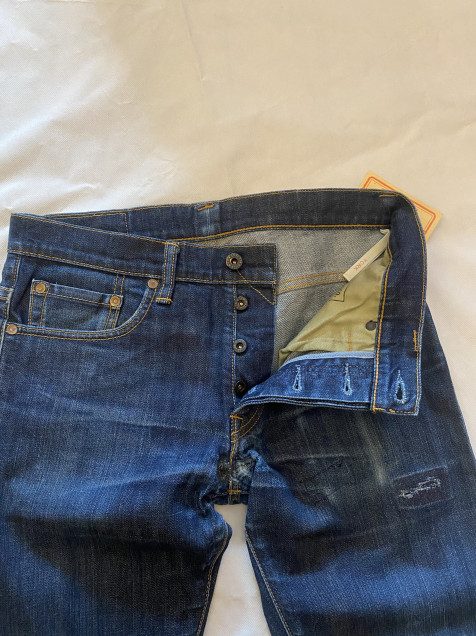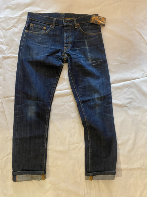 Este modelo presenta un lavado azul oscuro con desgaste natural en zonas de uso, aportando un look auténtico y con carácter. Destaca por su confección selvedge visible en el dobladillo, detalle altamente valorado dentro del denim de calidad.
