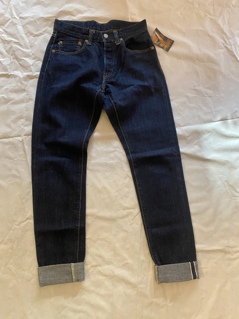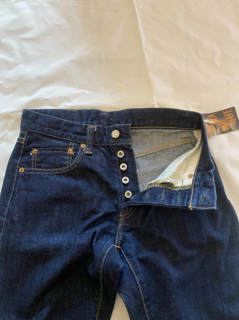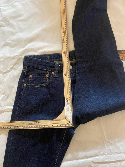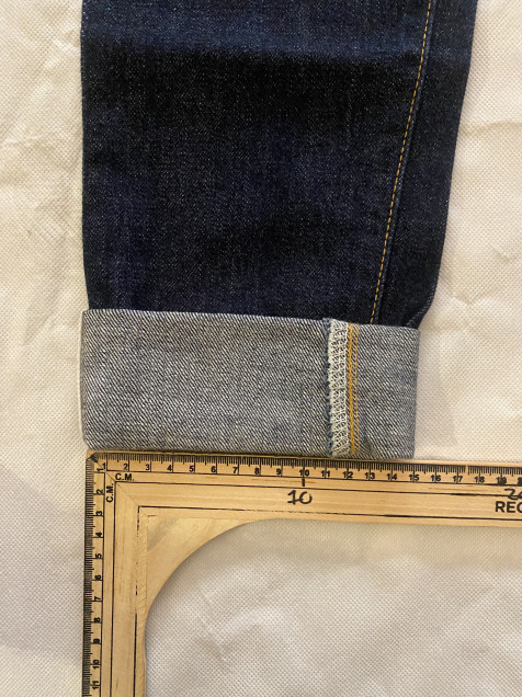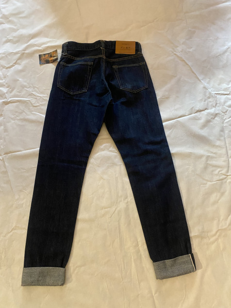 Presenta un lavado azul oscuro con textura rígida y ligera evolución natural en el desgaste, ideal para quienes buscan un denim que envejezca con carácter. El detalle de orilla selvedge visible en el dobladillo confirma su construcción premium.