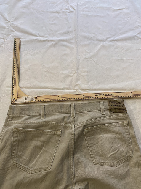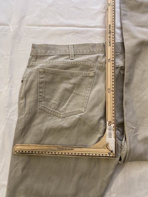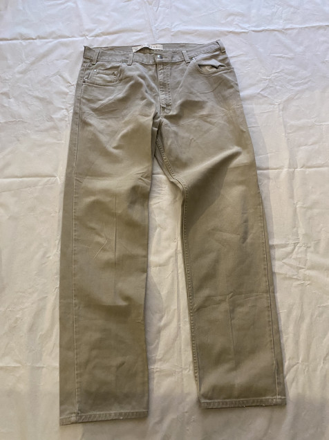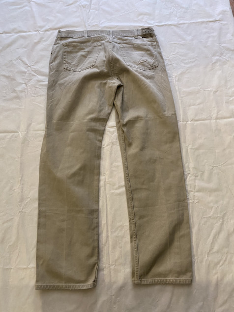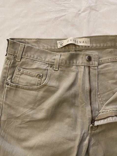 Denim en tono beige fácil de combinar, con corte recto que funciona para outfits casuales o más limpios.