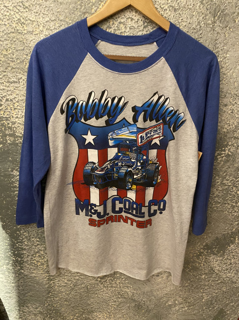 Playera tipo raglan manga 3/4 de Bobby Allen y M&J Coal Co., inspirada en estética racing americana.