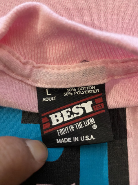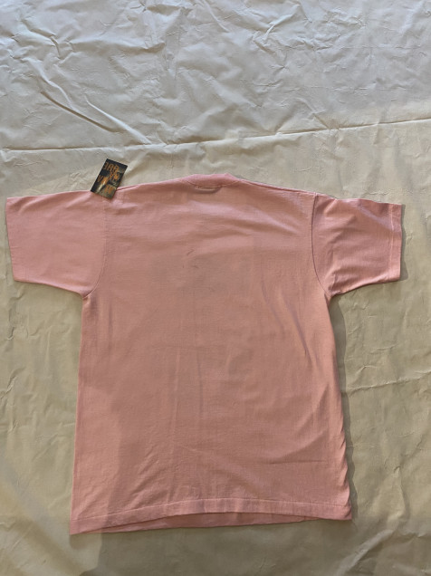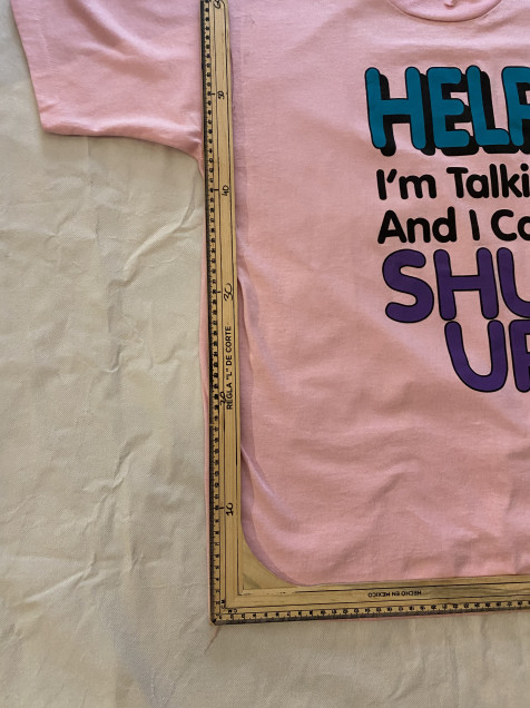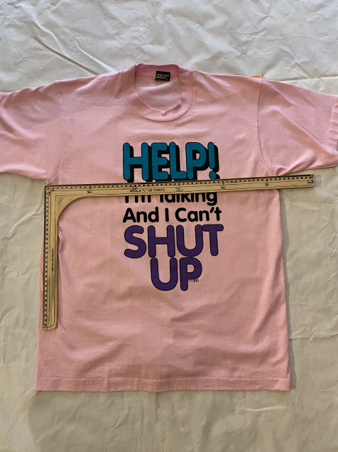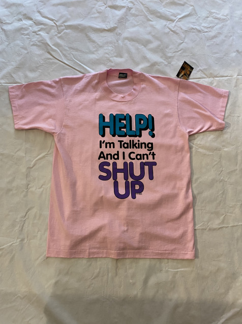 Playera vintage en color rosa con gráfico tipográfico “Help! I’m Talking And I Can’t Shut Up”, sobre blank de Fruit of the Loom Made in USA. Construcción single stitch, característica de prendas 90s, con estética divertida y llamativa.