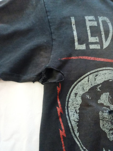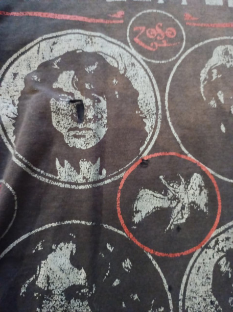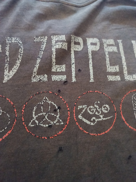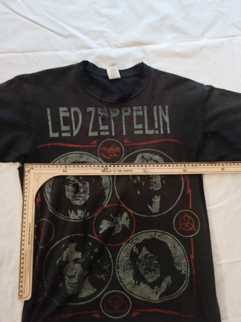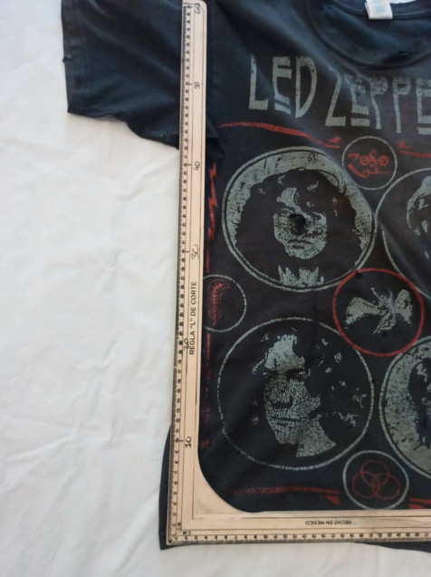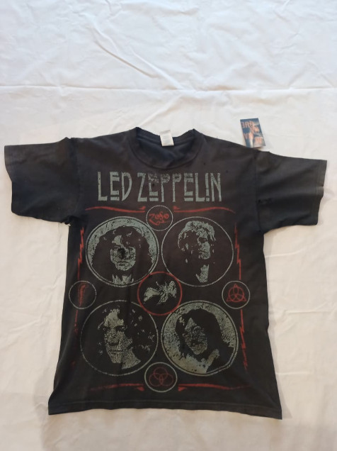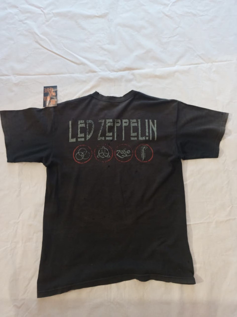 Playera de Led Zeppelin con print frontal de los integrantes y detalles simbólicos, complementada con print trasero con nombre de la banda y elementos icónicos. Una pieza con mucha presencia visual y conexión directa con fans del rock clásico.