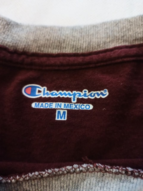 Playera tipo ringer de Champion en tono vino con cuello y mangas en contraste gris.