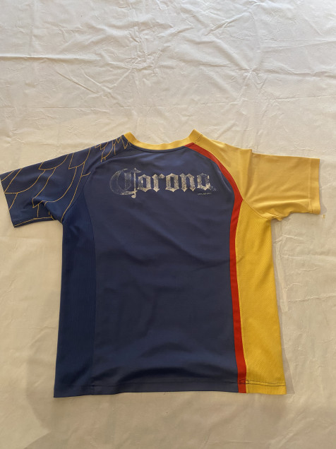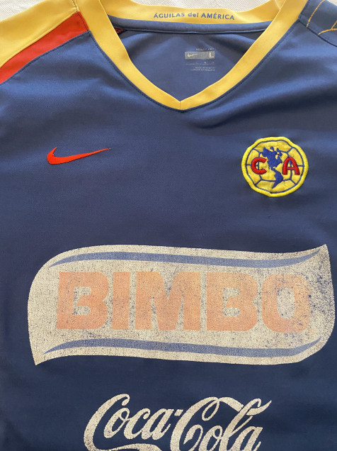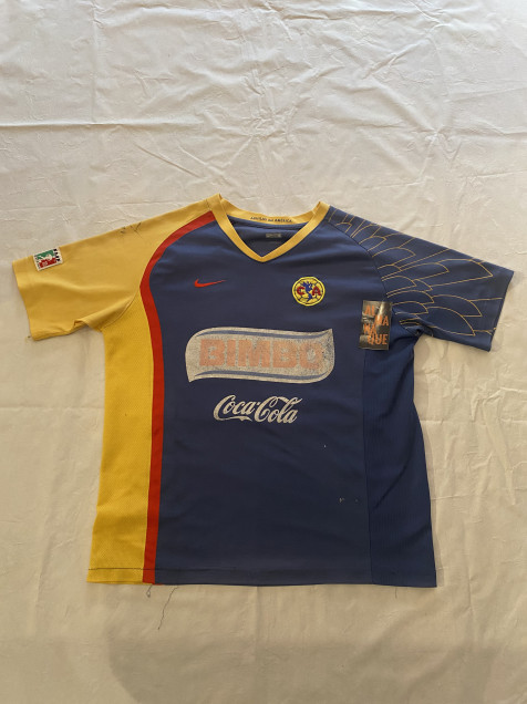 Jersey de futbol del Club América fabricado por Nike en color azul con paneles en amarillo y detalles en rojo. Presenta escudo al frente junto a patrocinadores Bimbo y Coca-Cola, característicos de la etapa del equipo en los 2000s.