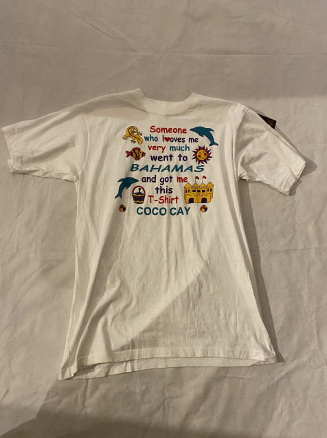 Playera vintage tipo souvenir con gráfico colorido alusivo a Bahamas y Coco Cay. Presenta ilustraciones de estilo playero con tipografía llamativa y composición divertida.