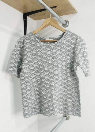 Blusa gris manga corta con textura de abanicos, es algo gruesa súper hermosa.
