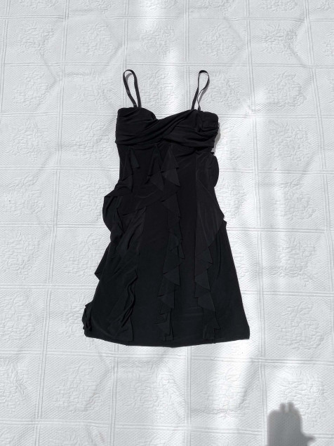 ππ«ππ§ππ: Vestido negro con copas marcadas y olanes verticales.