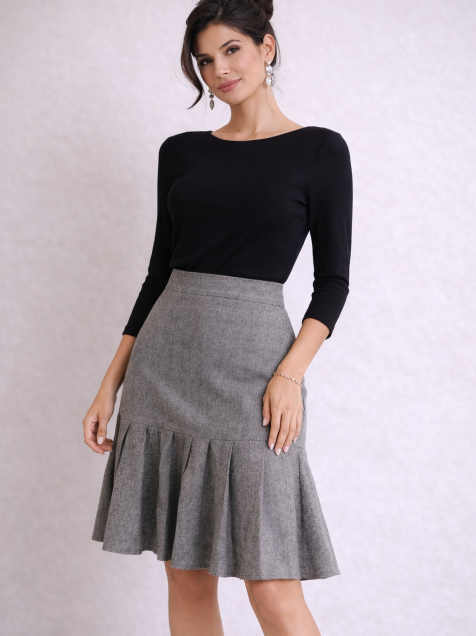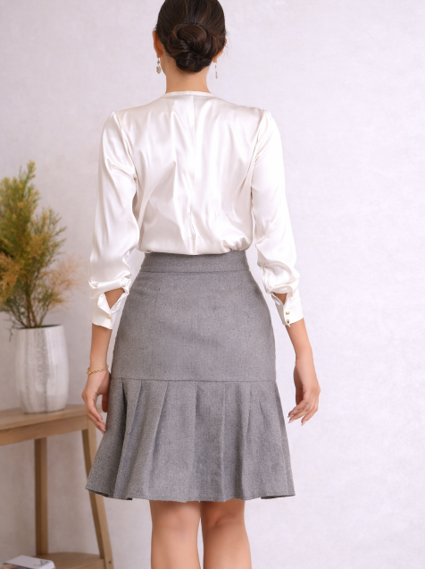 Esta preciosa falda con tablones en tono gris claro es perfecta para lograr un look femenino, sofisticado y muy versátil. Su diseño crea una caída fluida que estiliza tu figura y aporta ese toque clásico que nunca pasa de moda.