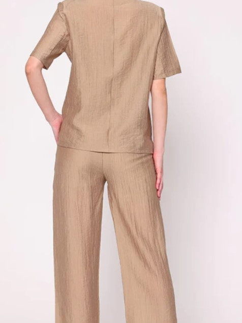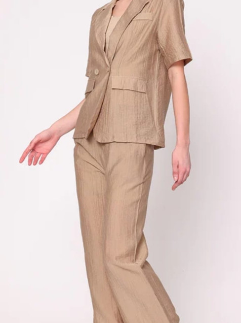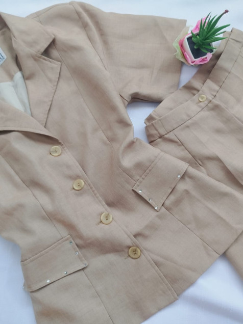 Este precioso conjunto en tono arena, compuesto por pantalón y saco, es la opción perfecta para lograr un look sofisticado, moderno y sin esfuerzo. Su diseño versátil te permite lucir impecable tanto en ocasiones formales como en outfits más relajados.