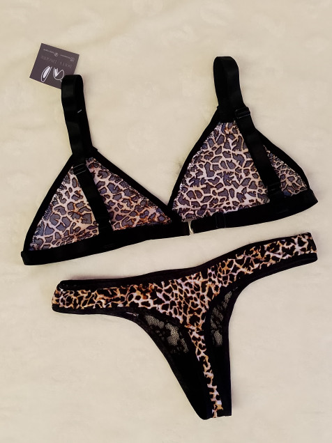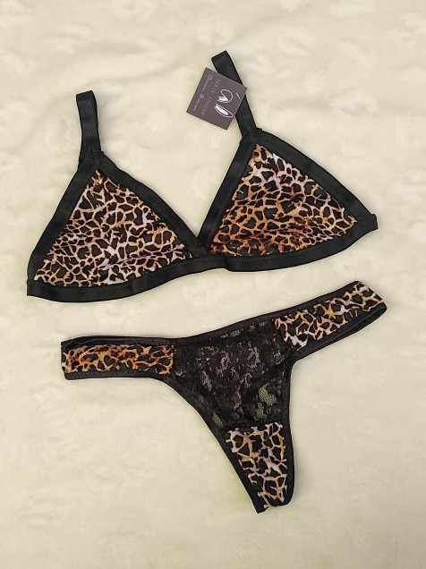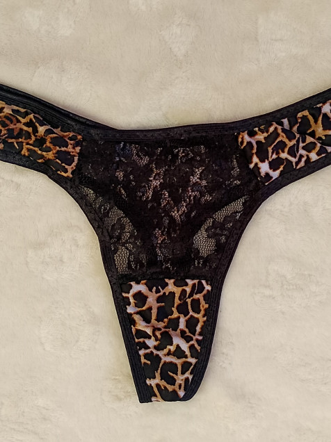 ✔ Panty tipo tanga con combinación de encaje negro y estampado animal