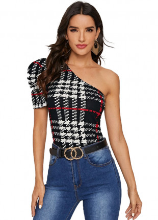 Blusa A Cuadros De Manga Farol Con Un Hombro Shein. Talla L.