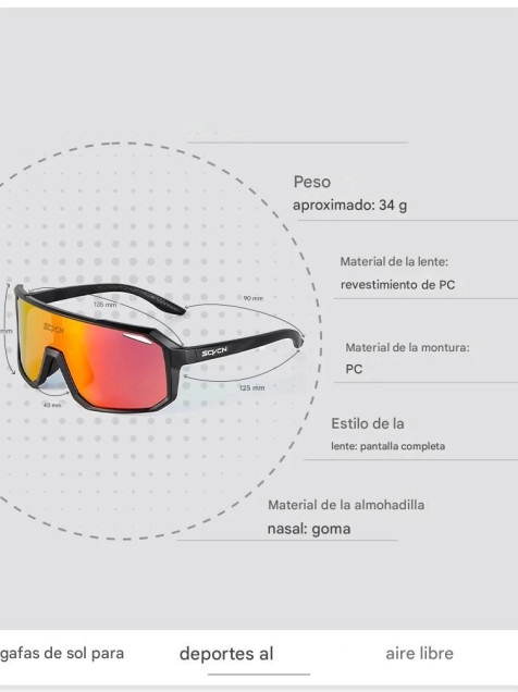 Características Diseño elegante, ligero y flexible, adecuado para más formas de cara. El diseño ligero es perfecto para motocicletas y bicicletas, conducir, pescar, caminar, escalar, hacer senderismo u otras actividades al aire libre