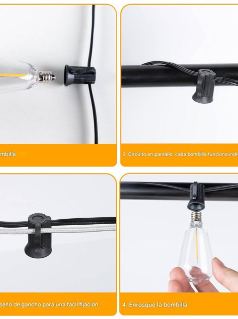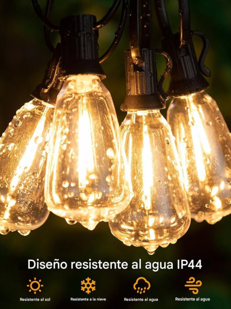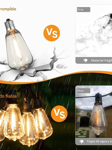 Luces de patio al aire libre irrompibles y duraderas: Estas luces de cadena para exteriores están hechas de plástico, mucho más irrompible que el tipo de bombilla de vidrio tradicional. La tecnología impermeable IP44 puede soportar teperatures extremos, climas lluviosos o húmedos.