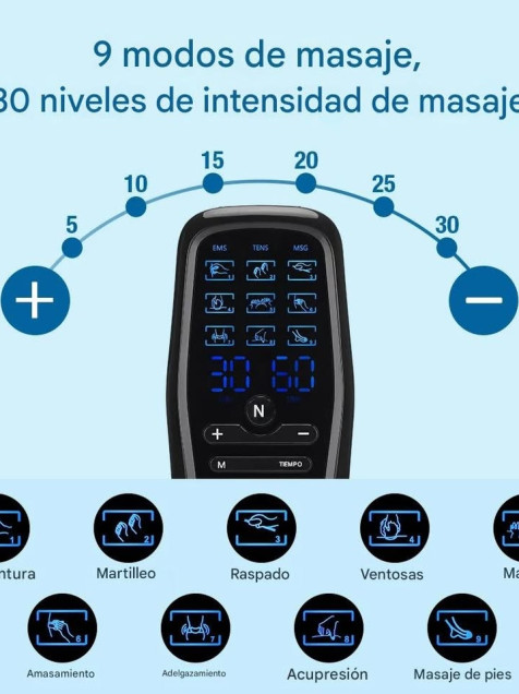 9 modos de masaje, 30 niveles de ajuste de intensidad: