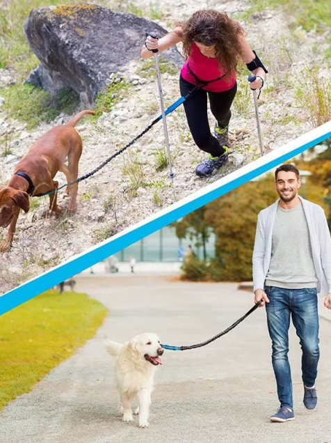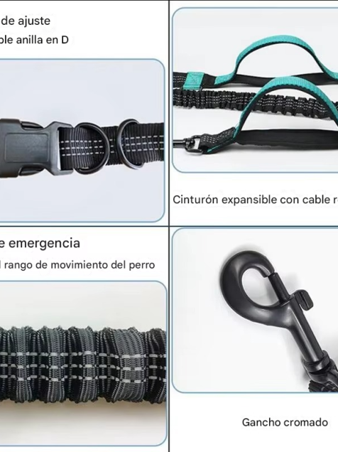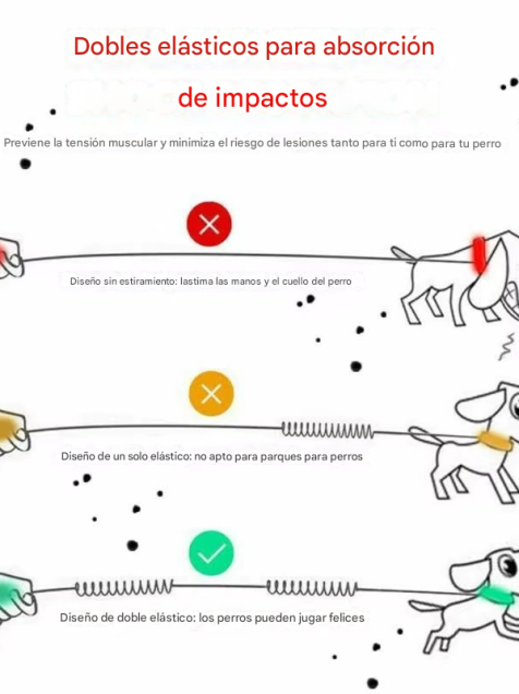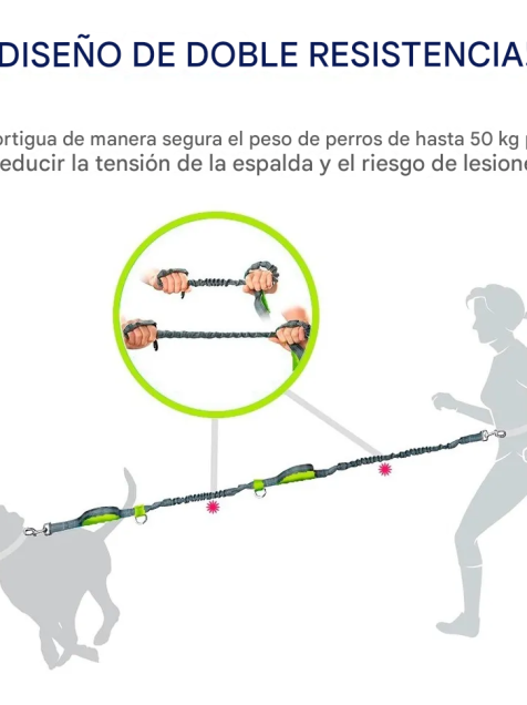 MATERIAL CON DOBLE AMORTIGUADOR: Nuestra correa cuenta con doble resorte que amortigua los tirones evitando tensión en la espalda y el riesgo de lastimarte, puedes controlar a tu mascota con tu peso corporal.