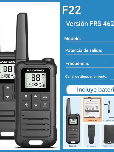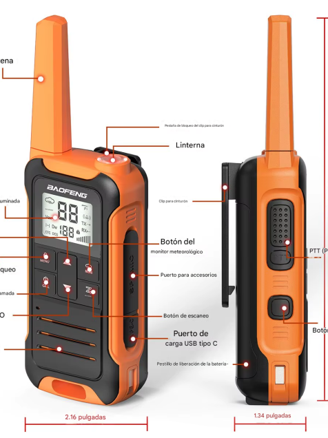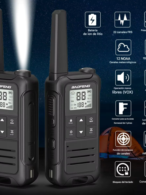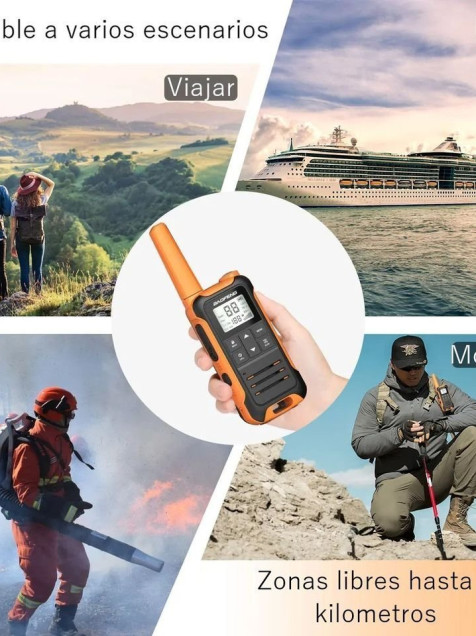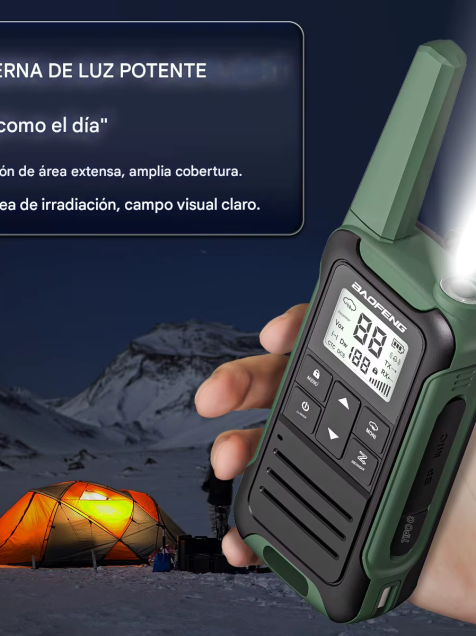 Gama larga: Con un alcance máximo de 3km-5km, este walkie talkie es perfecto para actividades al aire libre como la caza y camping.