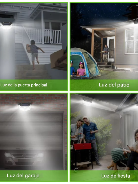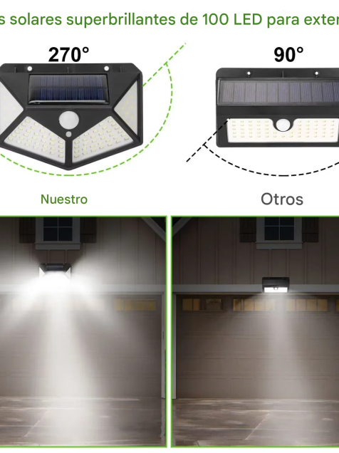 1. 【Más brillo con 100 LED】 Nuestro sensor de movimiento solar para exteriores se ilumina con 100 fuentes LED que proporcionan una solución de iluminación más brillante y potente que iluminará un área al instante y permanecerá más brillante por más tiempo.